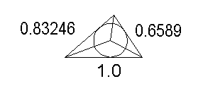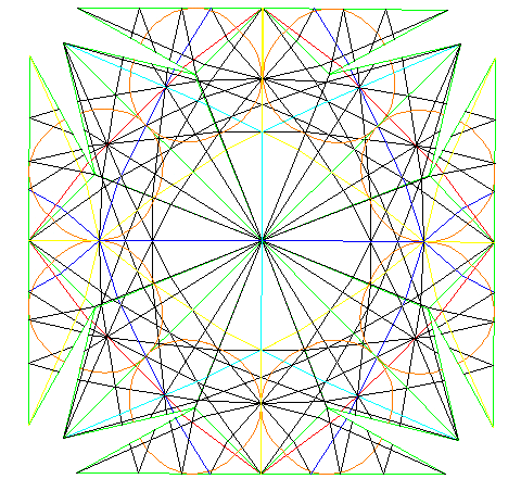 With this info, we can make a "template" drawing from which you can assemble the 48 LCD polyhedron. You will need 6 of these to put the polyhedron together. The circles indicate the cones of light coming out of the polyhedron. The 3 extra lines from the circle center out to the vertices are drawn to show you the irregular tetrahedron "cap" placed on each of the 48 LCD triangles.