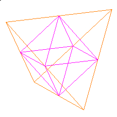 Next, join all the mid-edges together. This defines an octahedron inside the tetrahedron. Dividing the edges of the tetrahedron into 2 halfs results in what is called a 2-frequency tetrahedron.