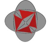 All four of the square’s edges in the ellipse of Figure #8 are Octahedron edges. Each pair of opposite edges of the Octahedron is part of an ellipse. Therefore, there are two orthogonal ellipses in the same plane. Figure #9 shows both ellipses defined by the motion of 4 Jitterbug vertices.