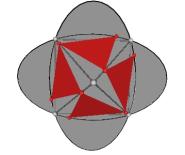 In one sub-Octahedron zone position it is seen that the Jitterbug forms another, smaller VE. (See Figure #19.) Being another VE configuration, we can draw another pair of smaller ellipses within the original ellipses. This construction of another sub-VE within the original VE by following the ellipse paths can be continued to form sub-sub-VEs, etc. and therefore sub-sub-Jitterbugs.