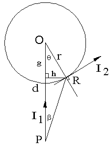 We next want to express the angle alpha in terms of theta and the distance "d" (the distance from the circle center "O" to I1 at P.) So, consider the following diagram.