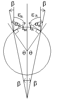 In the first illustration we see the current element IR on the right, tangent to the circle, at some angle theta. We construct the mirror of this current element about the right-left dividing line. This gives IM. Note that angles alpha and epsilon are the same as defined by the right current element.